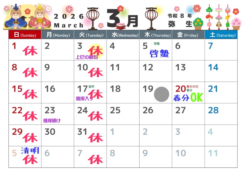 令和8年3月は、祝日にかかわらず、月、水、木、金、土曜の施術です。